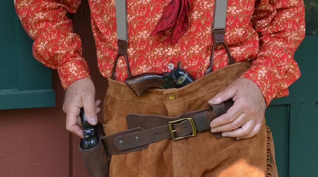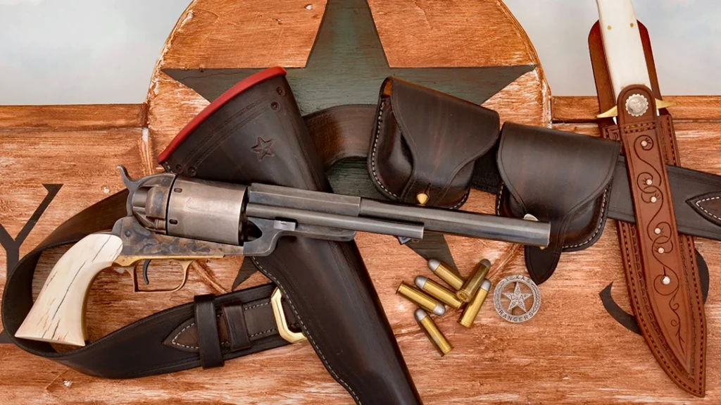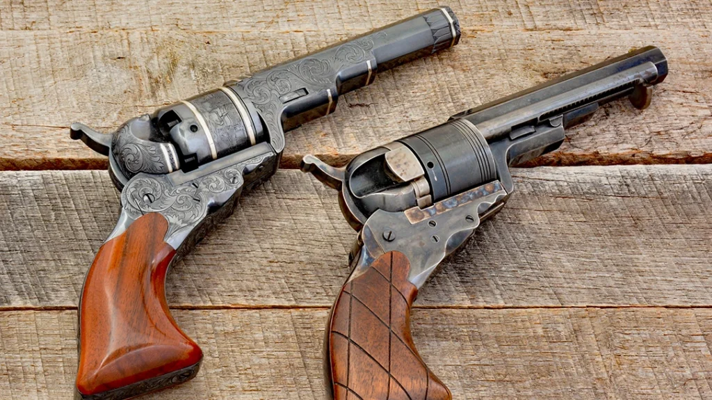 Pictured above are an antiqued reproduction .44 double action cap-and-ball model and an antiqued reproduction Single Action conversion chambered in .44 Colt. Both guns were handcrafted by R.L. Millington for Guns of the Old West using reproduction Pietta Starr models, which are highly authentic to begin with. The Starr, Paterson, Walker and Dragoon reproductions comprise a set of one-of-a-kind cartridge conversions that may defy logic, but illustrate a period in the Post-Civil War era when folks learned to “make do” with whatever they had.