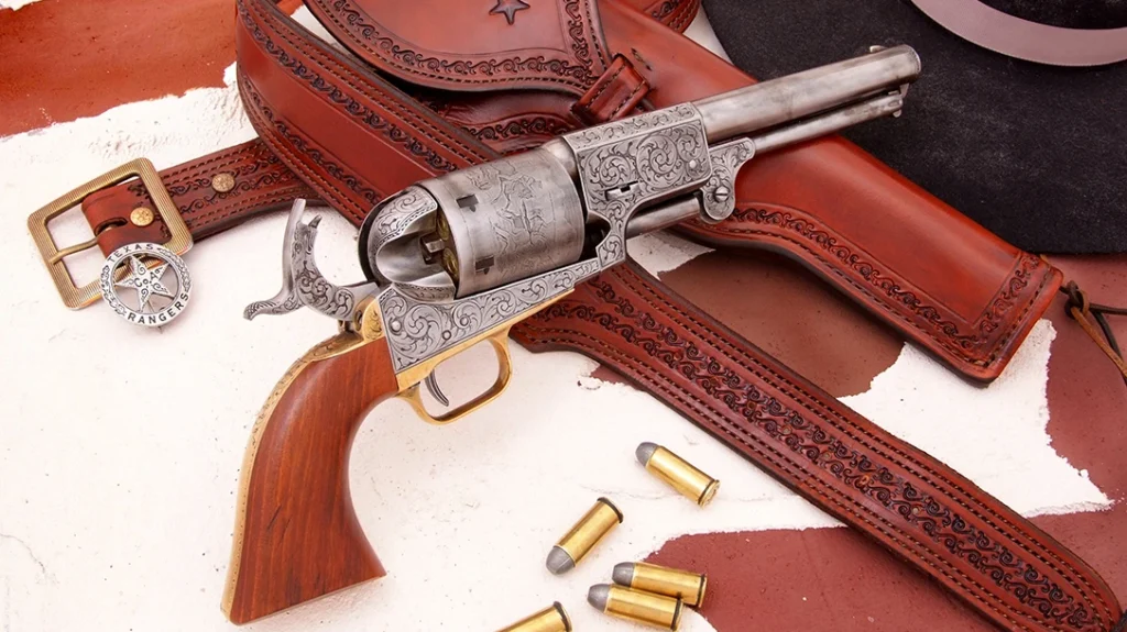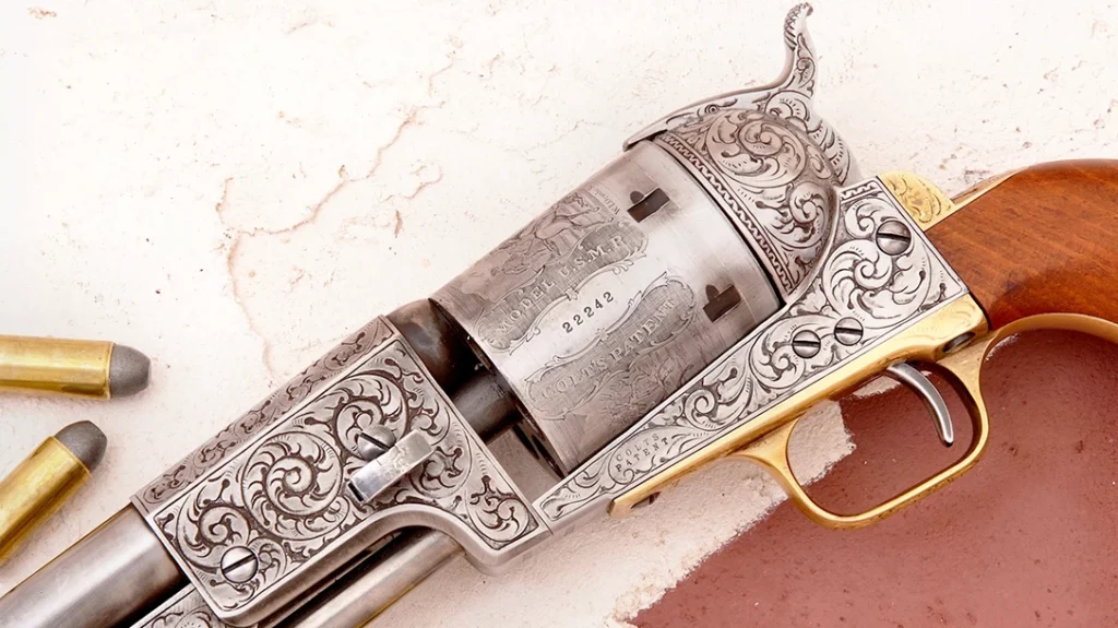The original gun is part of the Woolaroc Museum collection in Bartlesville, Oklahoma.The exact physical duplicate pictured is built on a 3rd. Generation Colt Blackpowder Arms Co. Paterson frame and is one of only three copies handmade in the late 1990s by R.L. Millington. All three copies are in private collections today.