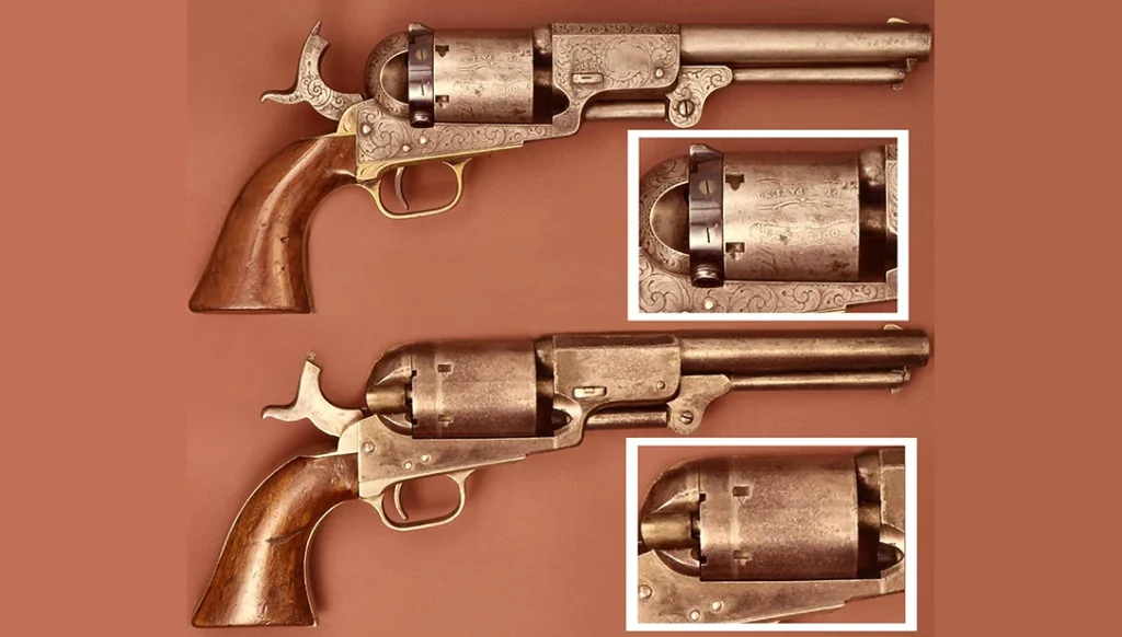 Is there any practicality to a Paterson cartridge conversion? It might have seemed a fool’s errand to modify a 30 year old 5-shot Paterson .36 caliber percussion pistol to fire .41 caliber metallic cartridges, but 150 years later this singular Paterson remains unique in the world. Was it the revolver of an eccentric gunman or an old pistol that had some sentimental value? We’ll never know. What we do know about this Paterson is that if one wanted a lightweight pistol that could be easily carried in a waistband, a pistol without a triggerguard, or even an exposed trigger until the hammer was cocked, and in a potent .41 caliber chambering, this would probably have been it.