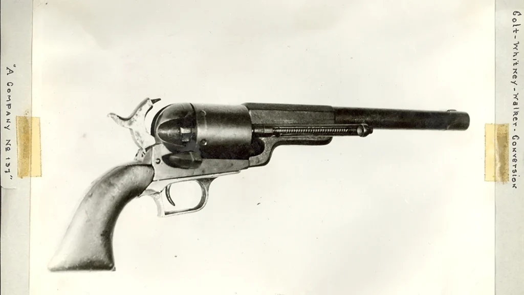 While a Colt Dragoon conversion is a rare bird, consider how rare a Walker Colt conversion would be. The question is, “Were there any?” And the answer is “yes”, at least once! The example pictured in the archival photo above, from the Connecticut State Library, shows a Walker originally issued to Texas Ranger Company A, with serial number 137. The design, which is superbly documented, shows a revolver that has received a Richards-Mason style conversion using the original cylinder with the back cut off, cylinder ratchet milled, chambers bored through, and an added breechring. The original hammer has been fitted with a firing pin and the right recoil shield deeply relieved to match the breechring loading gate cutout. The size of the loading channel is such that it also exposes the cylinder ratchet, which was common on most conversions. The gun uses an early-style, and somewhat crude, spring loaded ejector housing with a Colt-style round (donut shaped) ejector rod head generally seen on early Model 1873 Colt Single Action revolvers (through approximately 1884). It also has a loading gate with an internal spring actuated plunger, another feature based on Richards, Richards-Mason, and 1873 Colt design patents. This would give the impression that the conversion on this Texas Ranger Walker was done in the early 1870s, which makes this gun, and the singular .45 Colt caliber reproduction of that gun pictured below, (which was done by R.L. Millington for Guns of the Old West), all the more intriguing, and yet there are even stranger conversions to be considered!
